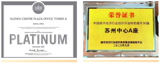 蘇州中心A座先后斬獲LEED運營期既有建筑鉑金級認證、LEEDBDC金級認證以及中國綠色建筑星級認證,入選“全國特色樓宇30強”,成為長三角首個同時擁有綠色認證與運營認證的商辦綜合體。樓宇所在的蘇州中心項目打造業內領先的建筑全生命周期數字智慧管理系統“心云平臺”。平臺上線后,通過數字化手段,實現樓宇能耗降低25%、節水效率提升30%。