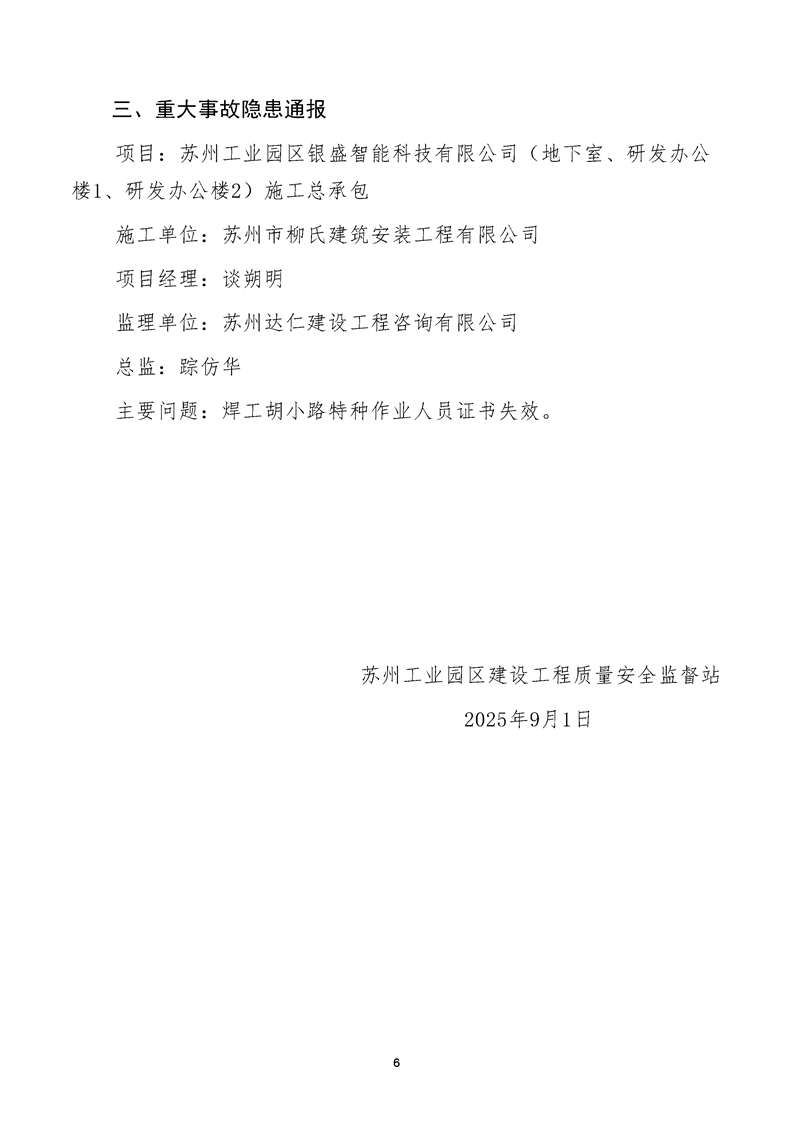園區質安站關于8月份建筑質量安全綜合檢查、揚塵防治不良信息的通報