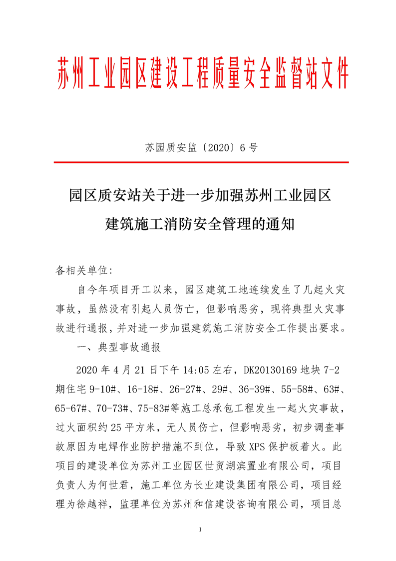 園區(qū)質(zhì)安站關(guān)于進一步加強蘇州工業(yè)園區(qū)建筑施工消防安全管理的通知