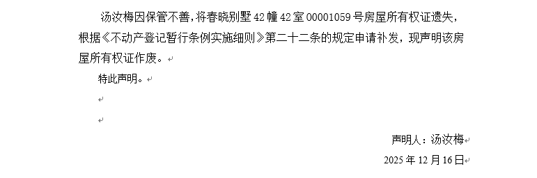關(guān)于春曉別墅42幢42室O0001059號(hào)房屋所有權(quán)證遺失聲明