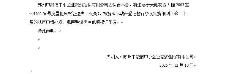 關于天翔花園3幢2003室00165176號房屋他項權證遺失聲明