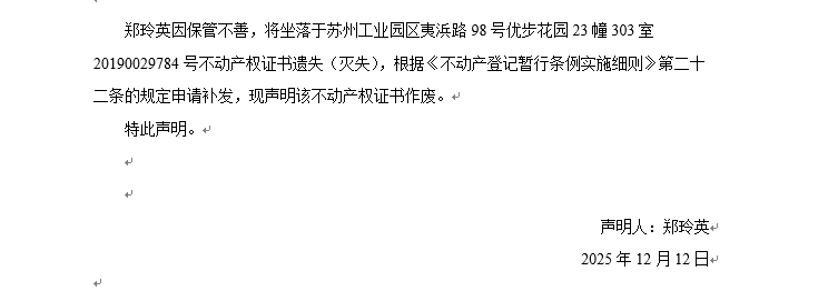 關于蘇州工業園區夷浜路98號優步花園23幢303室20190029784號不動產權證書遺失聲明