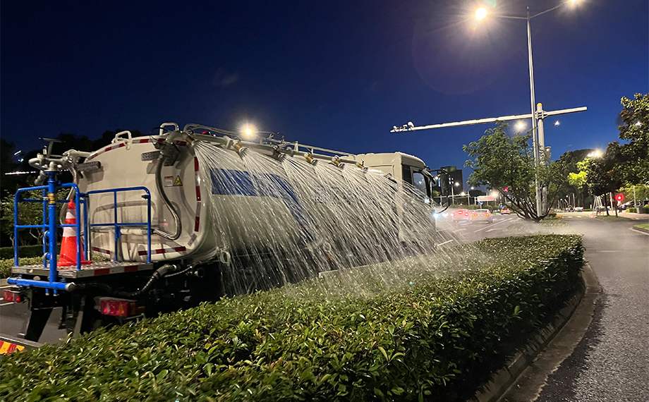 面對高溫干旱,傳統澆水方式疲于應對大規模綠化養護的需求。為此,園區市政服務集團指導生產企業,共同研發新型智能水車,其獨特設計的多向可調噴頭及前后水炮,通過駕駛室智能控制系統實現精準灌溉,既節省了人力成本,又大幅提升了澆水質量與效率。這一創新技術的應用,為園區綠化帶來了及時而充足的“甘霖”,確保了每一株植物都能得到充分的滋養。