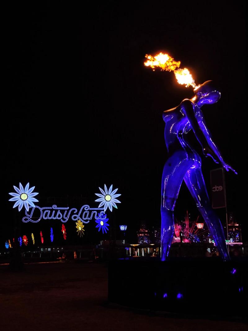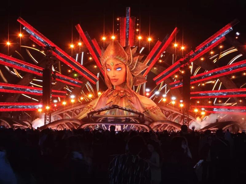 全球頂尖團(tuán)隊(duì)設(shè)計(jì)的日升女神kineticFIELD主舞臺(tái),通過精密機(jī)械實(shí)現(xiàn)女神雙臂隨樂律動(dòng),配合激光、火焰與同步煙花,首日便誕生百萬級(jí)傳播的“女神”名場(chǎng)面。circuitGROUNDS舞臺(tái)以360度巨型LED墻構(gòu)建科技矩陣,stereoBLOOM舞臺(tái)以前衛(wèi)工業(yè)風(fēng)見證多位國際大咖中國首秀,boomboxARTCAR移動(dòng)舞臺(tái)則以“巨型音箱”造型引爆隨行狂歡。