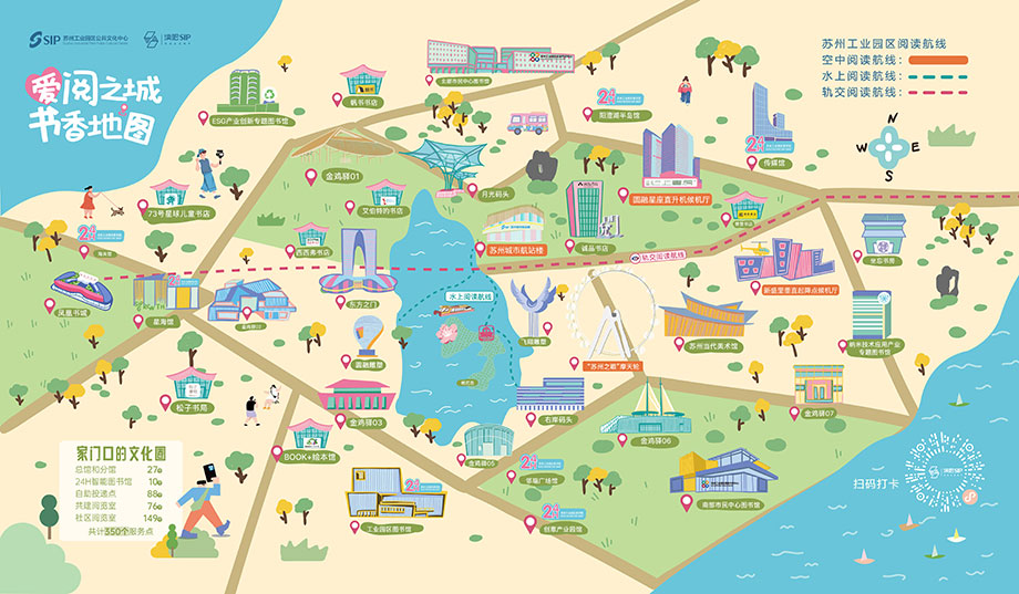 以摩天輪“云端書艙”為齒輪,“空中閱讀”“水上閱讀”和“軌交閱讀”三大閱讀航線同步啟航,從湖面到云端,從地鐵到書站,以開放性、創(chuàng)意性、融合性的新型閱讀空間,三維立體塑造園區(qū)流淌的閱讀網(wǎng)絡(luò)。其中,空中閱讀航線將在蘇州城市航站樓、圓融星座直升機候機廳、新盛里垂直起降點候機廳為旅客提供數(shù)字閱讀服務;水上閱讀航線將閱讀觸角延伸至“金雞湖號”雙體新游船、桃花島游客中心,提供“園區(qū)文旅”掃碼聽、休閑讀物隨手閱的文旅閱讀服務;軌交閱讀航線則重點圍繞軌交1號線,串聯(lián)沿線品牌書店、24小時圖書館、高客流量站點及文商旅機構(gòu)的優(yōu)質(zhì)閱讀資源。