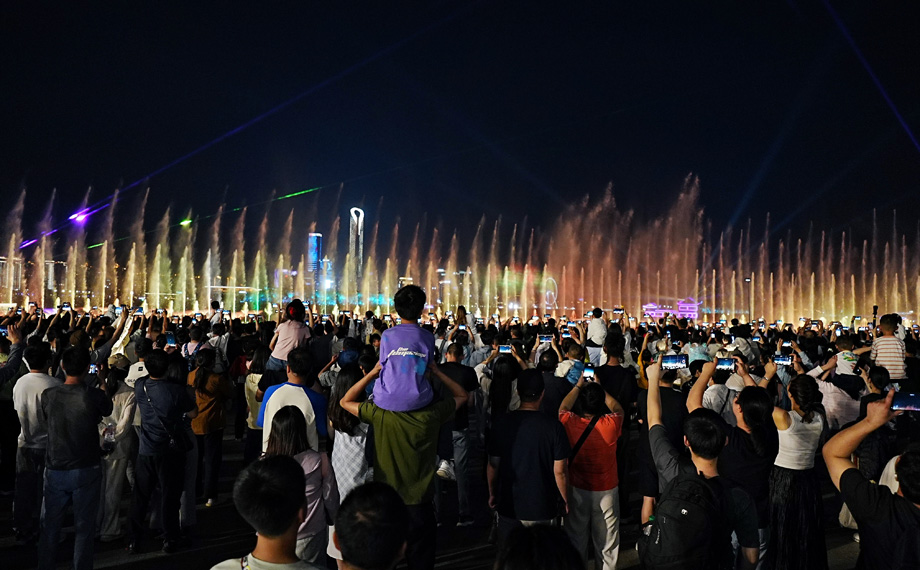 與右岸客廳遙遙相望的金雞湖音樂噴泉作為區域標志性景觀,同樣打造出聲、光、水、影交織的沉浸式藝術現場。每到周末,這里都聚集著大量拍照打卡的游客,成為園區夏日不可或缺的浪漫地標。