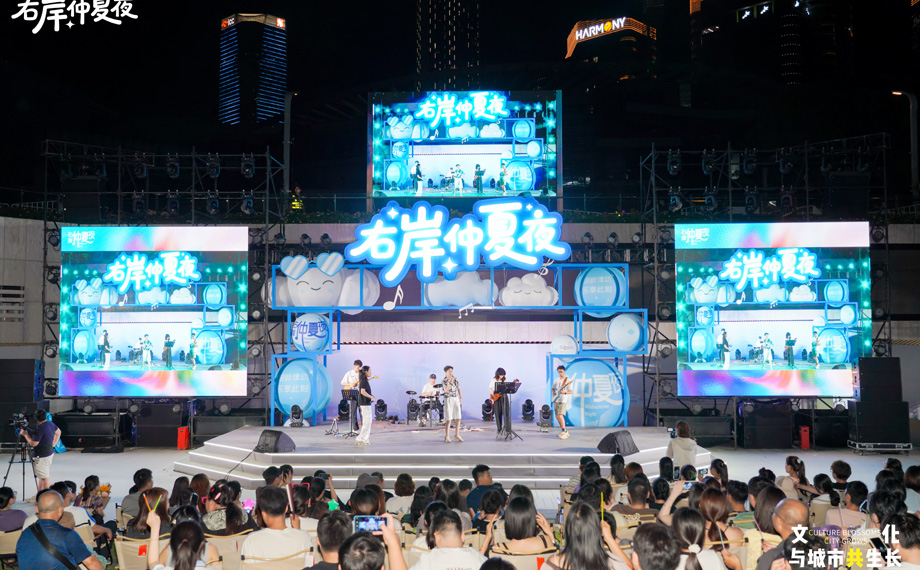 暮色漸染,金雞湖面倒映著天際最后一抹霞光。右岸客廳下沉廣場早已人頭攢動,市民游客翹首以待——又一個“右岸仲夏夜”即將啟幕。晚上七點半,音樂驟然響起,人氣樂隊以一首《離開地球表面》點燃夜空,瞬間引爆全場熱情。
