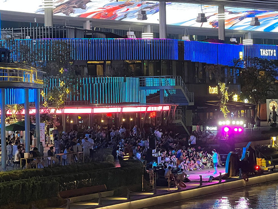 在園區(qū),藝術(shù)與人文交織的魅力夏夜并不僅限于右岸下沉式廣場。與“右岸仲夏夜”隔空相應(yīng),圓融天幕、月光碼頭等商業(yè)載體推出的一場場水岸音樂會,也不斷聚集著人氣與商氣,呈現(xiàn)著國際化新城區(qū)別樣的煙火時尚新場景。