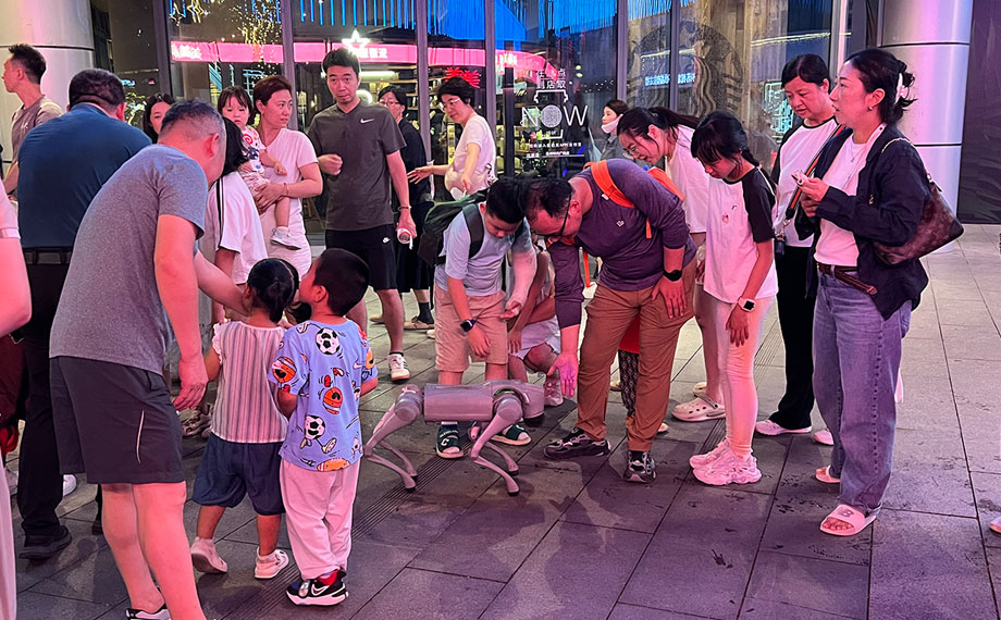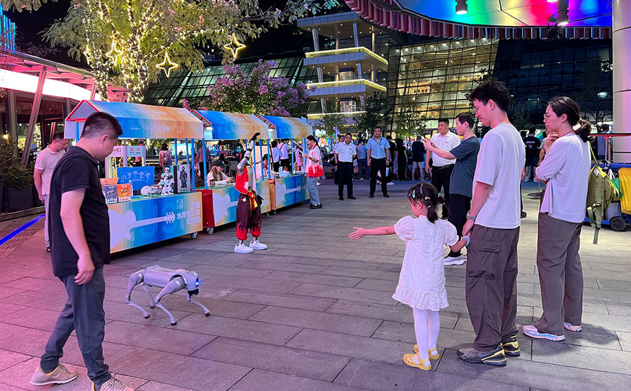 天幕下,變幻著燈光的地面噴泉讓愛玩水的萌娃樂此不疲,而臨近的水岸音樂會甄選市集上,哪吒造型的機器人、身姿靈活的機器狗也與大家握握手、跳個舞熱情互動,讓往來的大朋友、小朋友心動不已。“水岸音樂會積聚人氣,實現(xiàn)了很好的引流,不僅提升了市民的生活質(zhì)感,也為我們企業(yè)推廣搭建了全新的場景。機器人正當(dāng)熱點,我們與圓融合作,在圓融天幕和月光碼頭都設(shè)置了展臺,提供機器人的表演、互動,以及配套小機器人的售賣,對于展示企業(yè)形象、能力,展現(xiàn)園區(qū)高科技活力,都是很好的平臺。”八方機器人經(jīng)理朱錦介紹說。