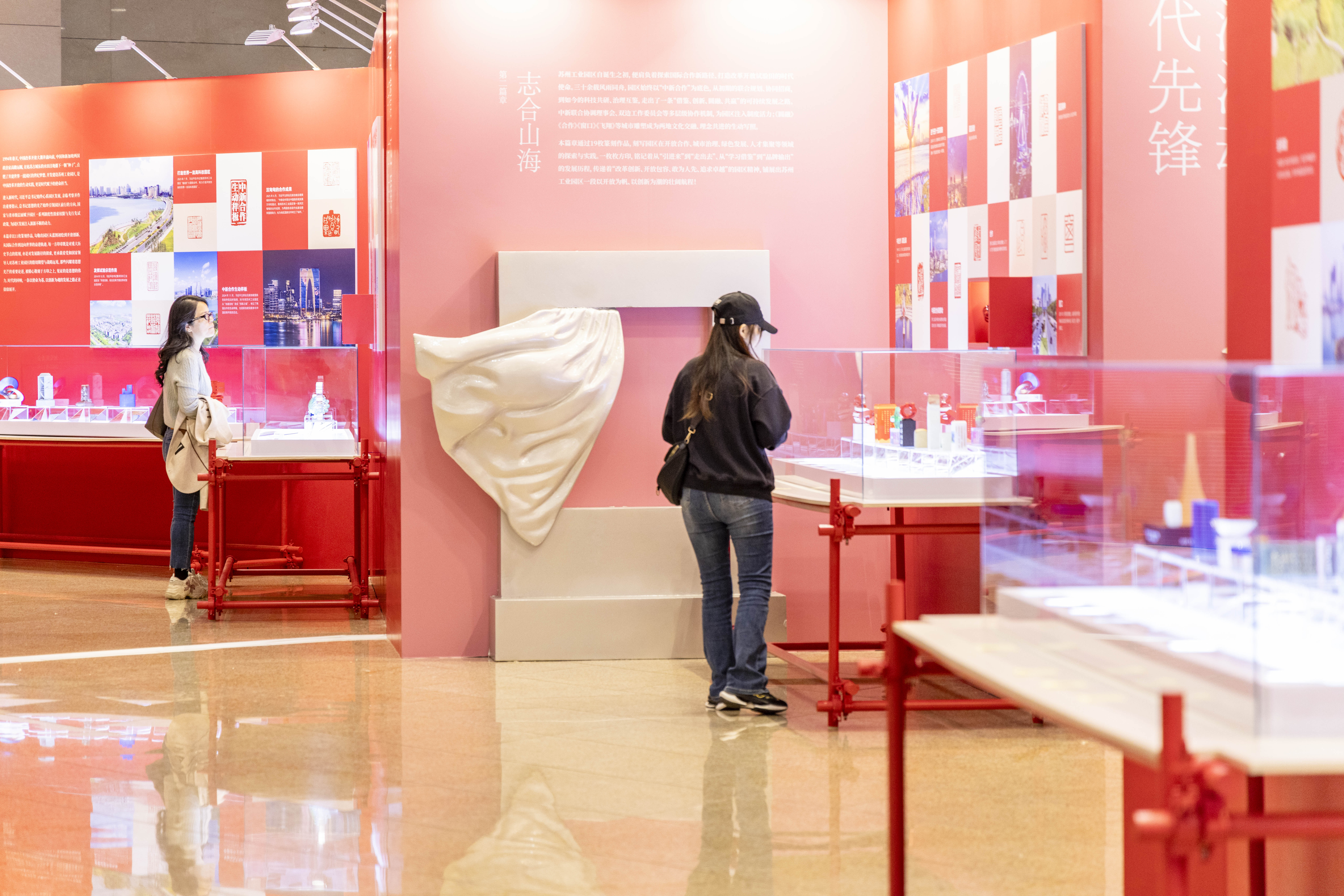 展廳內,一枚內置功放芯片的“勝浦三寶”印章,將傳統水鄉文化與現代科技融合;“領航擘畫”展陳區,“打造世界一流高科技園區”印章棱角分明,這枚由3D打印的印章,融合東方之門、納米產業園等園區地標;“圓融”主題印章,則以空心玻璃微珠為印材,彩色噴繪技術讓中國與新加坡合作的意象躍然印上……