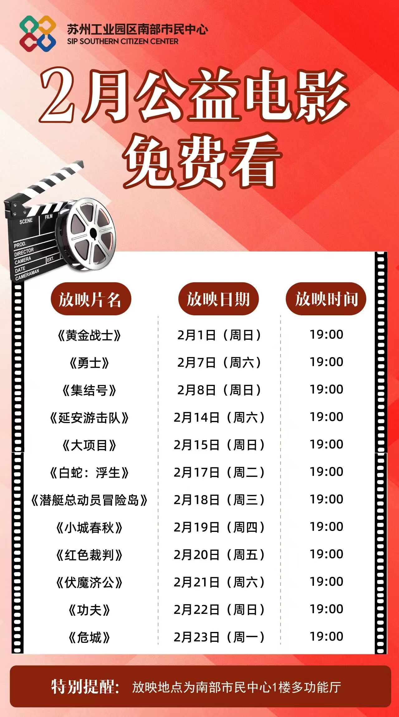 春節(jié)期間,文化惠民不打烊。園區(qū)南部、北部市民中心將推出公益電影展映,二十余場(chǎng)經(jīng)典影片免費(fèi)播放,包括《白蛇:浮生》《小城春秋》《功夫》等等,讓市民在團(tuán)圓之余,享受一份輕松愉悅的光影之樂(lè)。