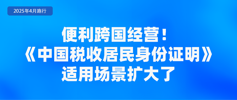 《關于〈中國稅收居民身份證明〉有關事項的公告》(國家稅務總局公告2025年第4號),為中國居民開展跨境經營提供保障和便利,自2025年4月1日起生效執行。《中國稅收居民身份證明》是納稅人在境外使用的證明其中國稅收居民身份的重要文件?!豆妗穬灮氖马棸ǎ和卣埂抖愂站用褡C明》適用場景。申請人應當根據實際情況選擇享受協定待遇或者非享受協定待遇的申請目的,后者覆蓋了近年來納稅人在境外遇到的多個場景。實現全流程網上辦。調整《稅收居民證明》內容。壓縮辦理時限。如果主管稅務機關能夠自行判定稅收居民身份,辦理時限由現行的10個工作日縮短至7個工作日。