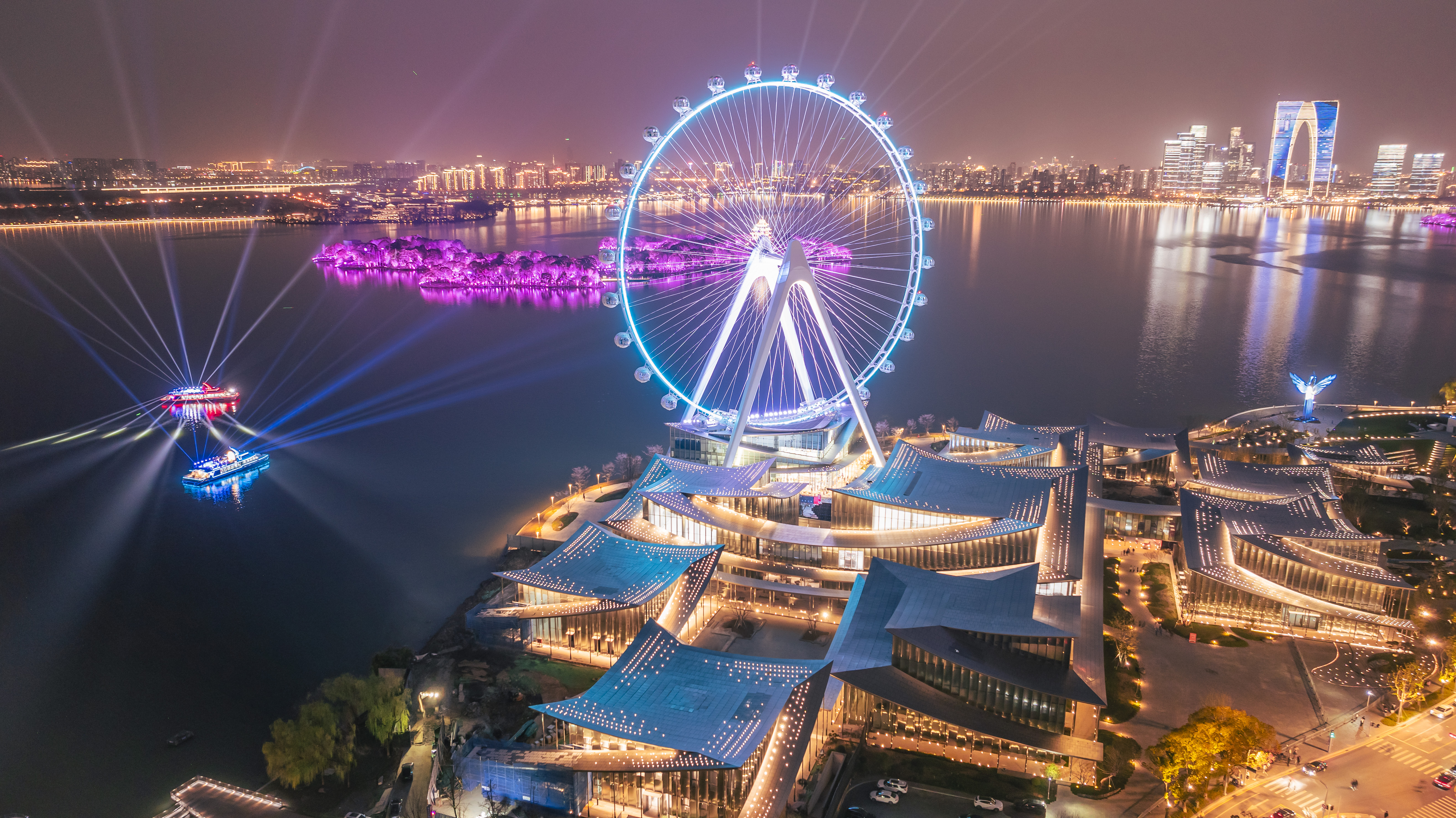 “蘇州之眼”摩天輪高128米,是亞洲最大的水上摩天輪,同時也是全球第八座回轉(zhuǎn)式太空艙摩天輪。它共設(shè)有28個全景轎廂,每個轎廂可容納25人,旋轉(zhuǎn)一圈約30分鐘,可360°俯瞰金雞湖及園區(qū)乃至蘇州全景,和傳統(tǒng)摩天輪相比,乘坐體驗(yàn)更加安全、愜意。