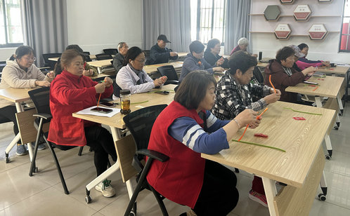“紅管”志愿者首先向居民們介紹柿子承載著“事事如意”的美好寓意。隨后,志愿者老師手持扭扭棒,逐步演示制作步驟:從花瓣的彎折技巧、葉片的造型塑造,到如何組合成飽滿的柿子,每一個環節都耐心講解、細致示范。居民們紛紛動手嘗試,有的低頭專注編織,有的與鄰座交流心得,還有的主動向老師請教細節現場氣氛溫馨融洽此次活動不僅讓大家在動手實踐中體驗到創作的樂趣,也在輕松愉快的互動中深化了鄰里交流,更將美好祝福傳遞到每個人心中。