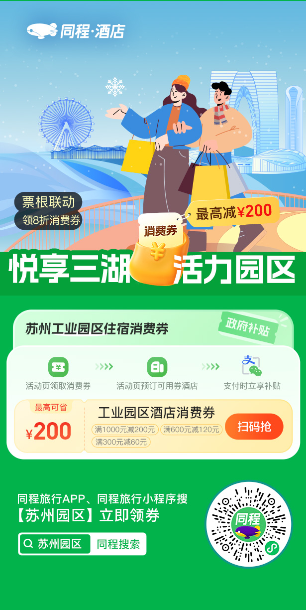 除餐飲、零售福利外,本次系列活動特別推出住宿消費券,進一步豐富消費場景,為市民本地度假及游客來園出行提供便利,發放周期持續至2026年2月28日,覆蓋元旦、春節假期。市民游客可通過同程旅行、攜程旅行申領,享受滿300元減60元、滿600元減120元、滿1000元減200元三檔8折福利,滿足周末度假、親友接待等多樣化住宿需求。