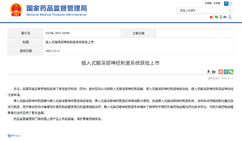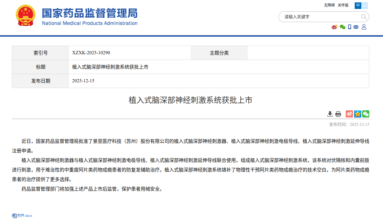 近日,國家藥品監督管理局(NMPA)正式批準景昱醫療科技(蘇州)股份有限公司的植入式腦深部神經刺激器、植入式腦深部神經刺激電極導線、植入式腦深部神經刺激延伸導線三類產品注冊申請。此次獲批的植入式腦深部神經刺激系統,作為全球首創侵入式腦機接口治療成癮類精神疾病產品,標志著中國在腦機接口治療成癮類精神疾病領域的技術已躋身全球領先行列,為全球難治性藥物成癮治療帶來突破性解決方案。