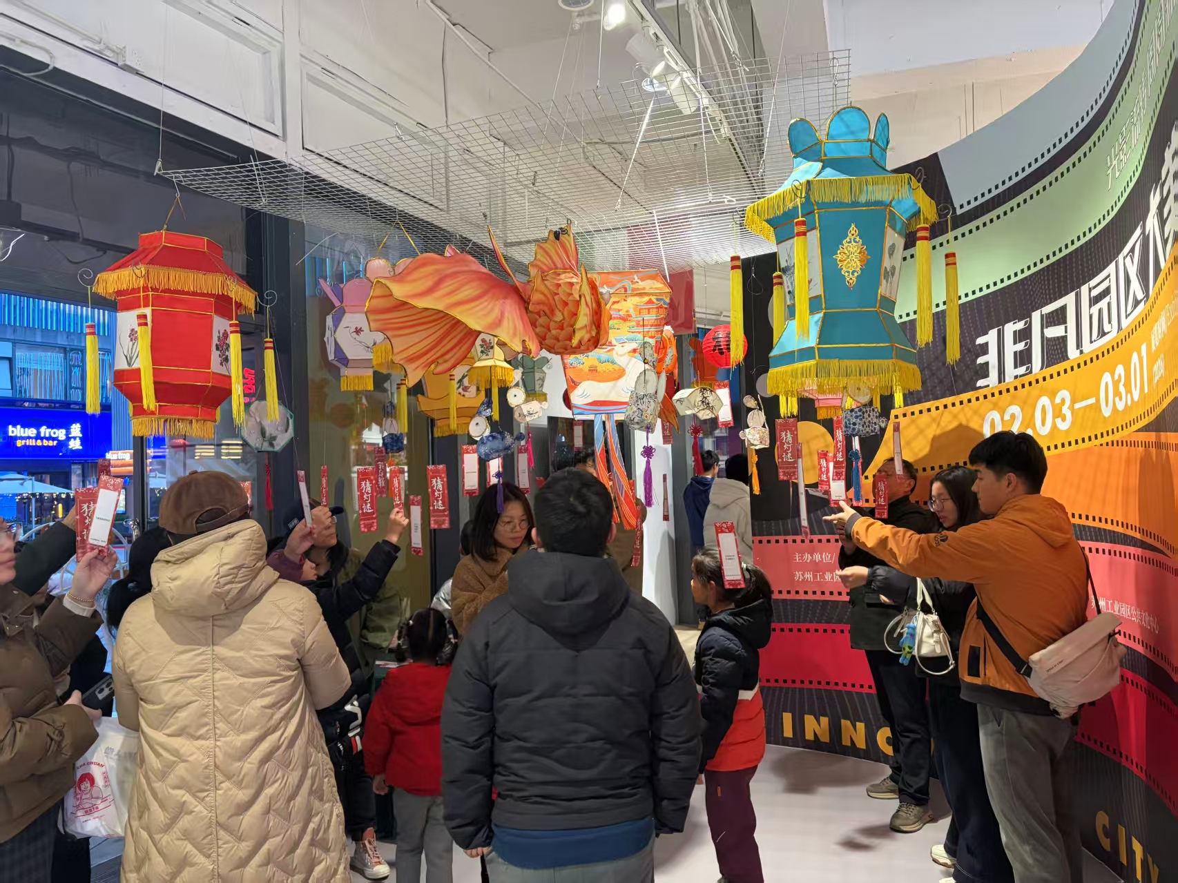 元宵當晚,“燈火映元宵 鄰里共團圓”鄰里上元集點亮全區各鄰里中心,猜燈謎、贈湯圓、飛花令、趣味游戲輪番登場,全新銀票兌禮玩法人氣高漲。主會場兆佳巷鄰里中心魚燈巡游、國潮樂隊、變臉表演精彩紛呈,成為元宵夜游熱門打卡地。此外,688藝術潮流空間、奧體中心商業廣場、久光百貨、新光天地蘇州等同步開展燈謎互動等活動,節日氛圍持續拉滿。