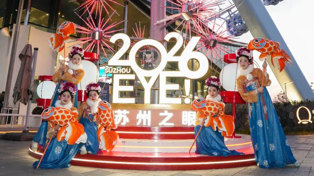 蘇州之眼元宵夜趣味活動輪番上線,市民可登高俯瞰萬家燈火,參與猜燈謎贏好禮。傍晚時分,國風舞者手持魚燈輕盈巡游;科技感十足的機器狗化身“送福使者”,與游客互動打卡,硬核科技與萌趣氛圍碰撞出別樣精彩。