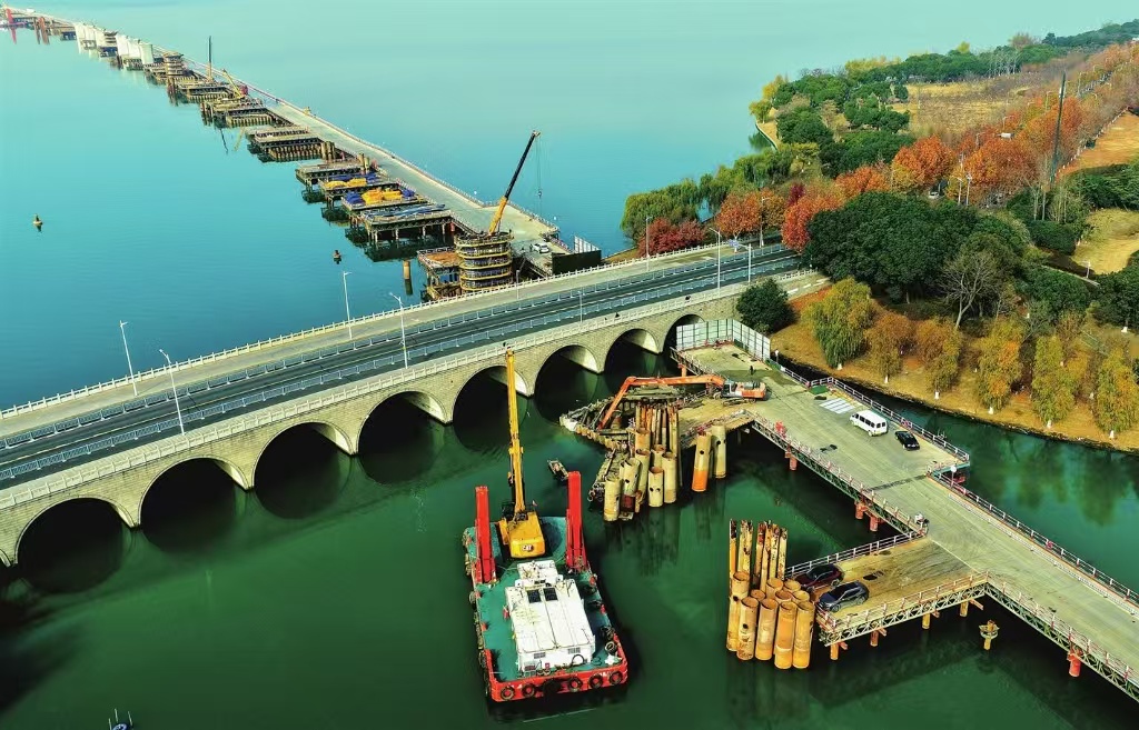 通蘇嘉甬高鐵建設正酣,穿越陽澄湖半島水澤路的水下橋墩施工如火如荼。