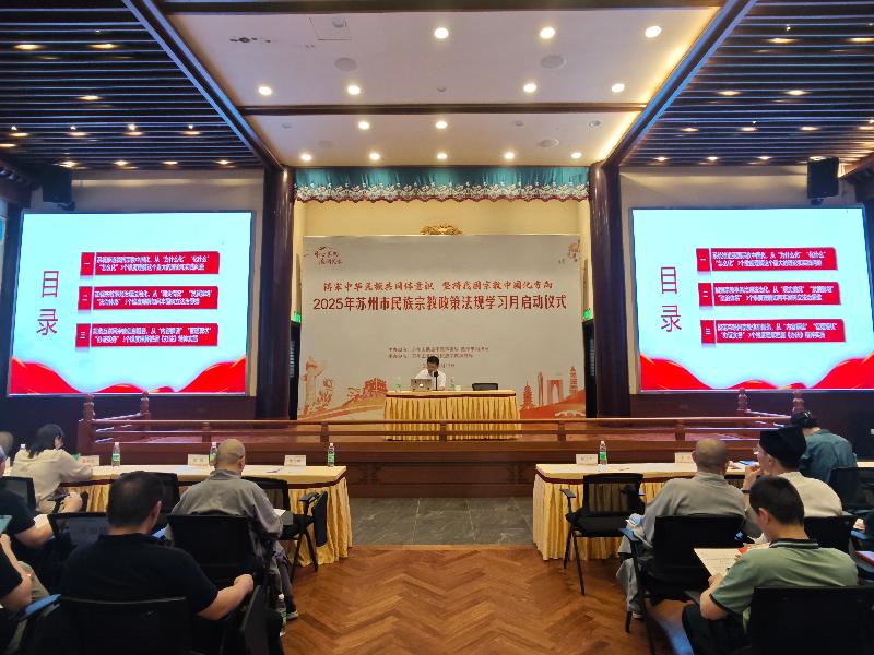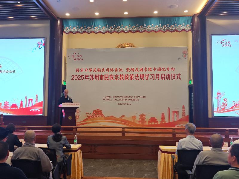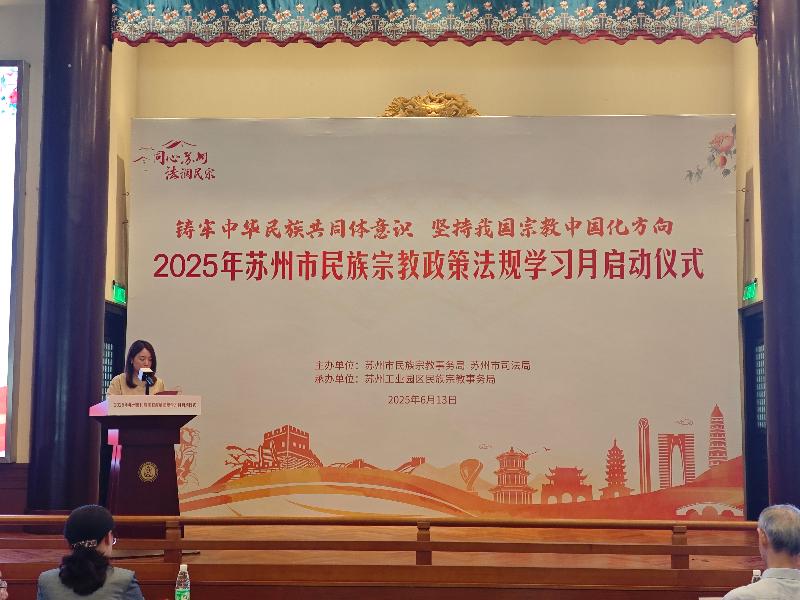6月13日下午,由蘇州市民宗局、蘇州市司法局主辦,蘇州工業園區民宗局承辦的2025年蘇州市民族宗教政策法規學習月系列活動在蘇州工業園區重元寺順利舉辦。園區宣傳和統戰部、各街道、各社區、民促會、各宗教團體、各宗教院校、各宗教活動場所有關負責人及社會各族各界代表人士等150余人參加了本次活動。