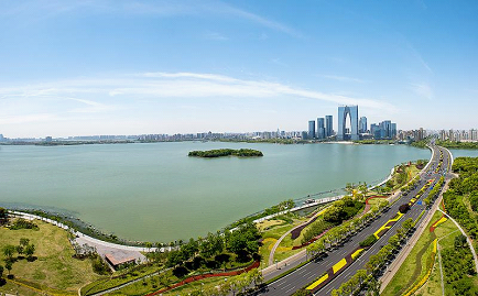 The east bank of the lake is more culturally rich and artistic. There are the Suzhou Eslite Bookstore, the about 500-meter Sky Screen and many art displays.