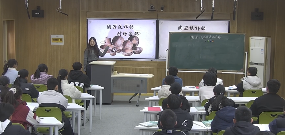唯亭學校張迪老師的《陶器紋樣的對稱密碼》,項目從傳統陶器紋樣入手,引導學生通過分類、觀察與建模,探索紋樣背后蘊含的平移、翻折、旋轉等圖形變換規律。在探究環節,學生不僅深入分析了紋樣中的對稱奧秘,還結合數列知識,解密了阿基米德螺旋線與等比螺旋線的“生長”邏輯。在實踐環節,同學們動手還原螺旋線圖案,并運用密鋪原理自主設計創意紋樣,在歷史之美與數學之理的融合中,深化了幾何直觀與空間想象能力。這堂課生動展現了數學與人文的深度聯結,體現了跨學科教學的創新與實踐。