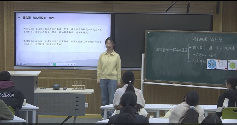 唯亭學校單夢琦老師的《蘇韻雅樂—探秘空靈鼓》以空靈鼓為載體,引導學生用幾何知識解析鼓身:通過俯視圖計算圓的扇形面積與弧長,借側視圖建立拋物線函數模型。進而探究發聲原理,發現音舌長度與振動頻率的負相關關系,并理解共鳴腔體對聲音的放大作用。最后,學生化身樂器設計師,運用對稱、序列與螺旋布局,親手規劃音階排列。整堂課將數學、物理與藝術創造深度融合,讓公式成為解讀藝術、設計聲音的生動語言。