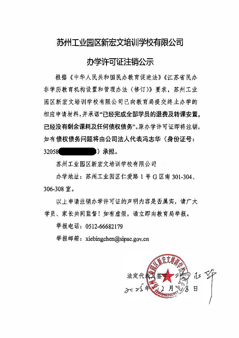 蘇州工業(yè)園區(qū)新宏文培訓(xùn)學(xué)校有限公司辦學(xué)許可證注銷公示