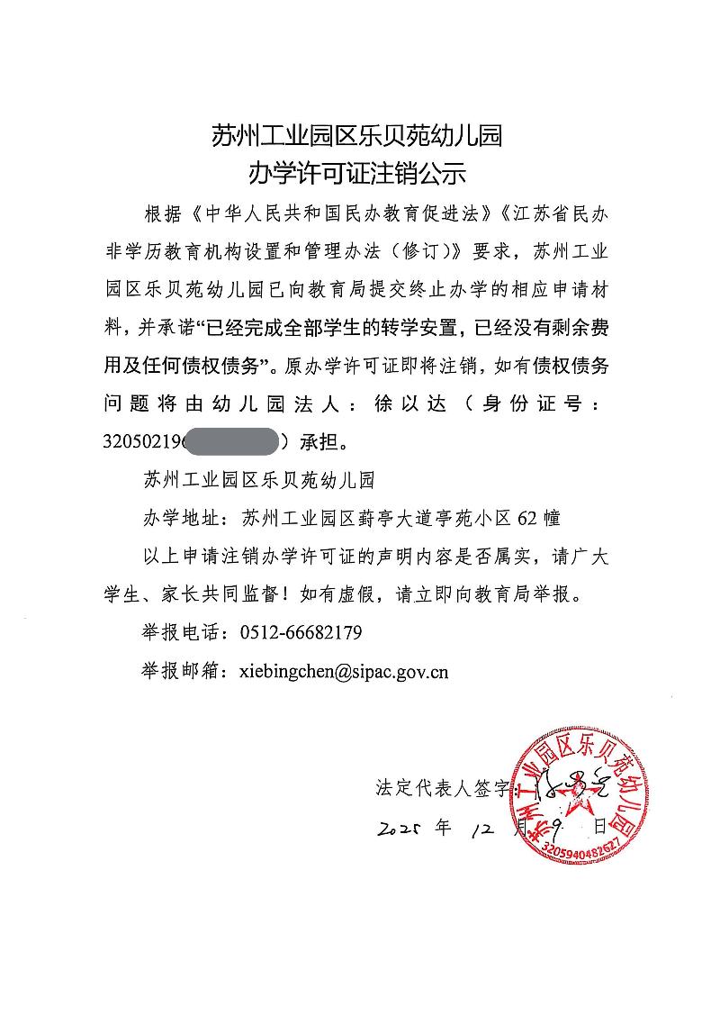 蘇州工業(yè)園區(qū)樂貝苑幼兒園辦學許可證注銷公示