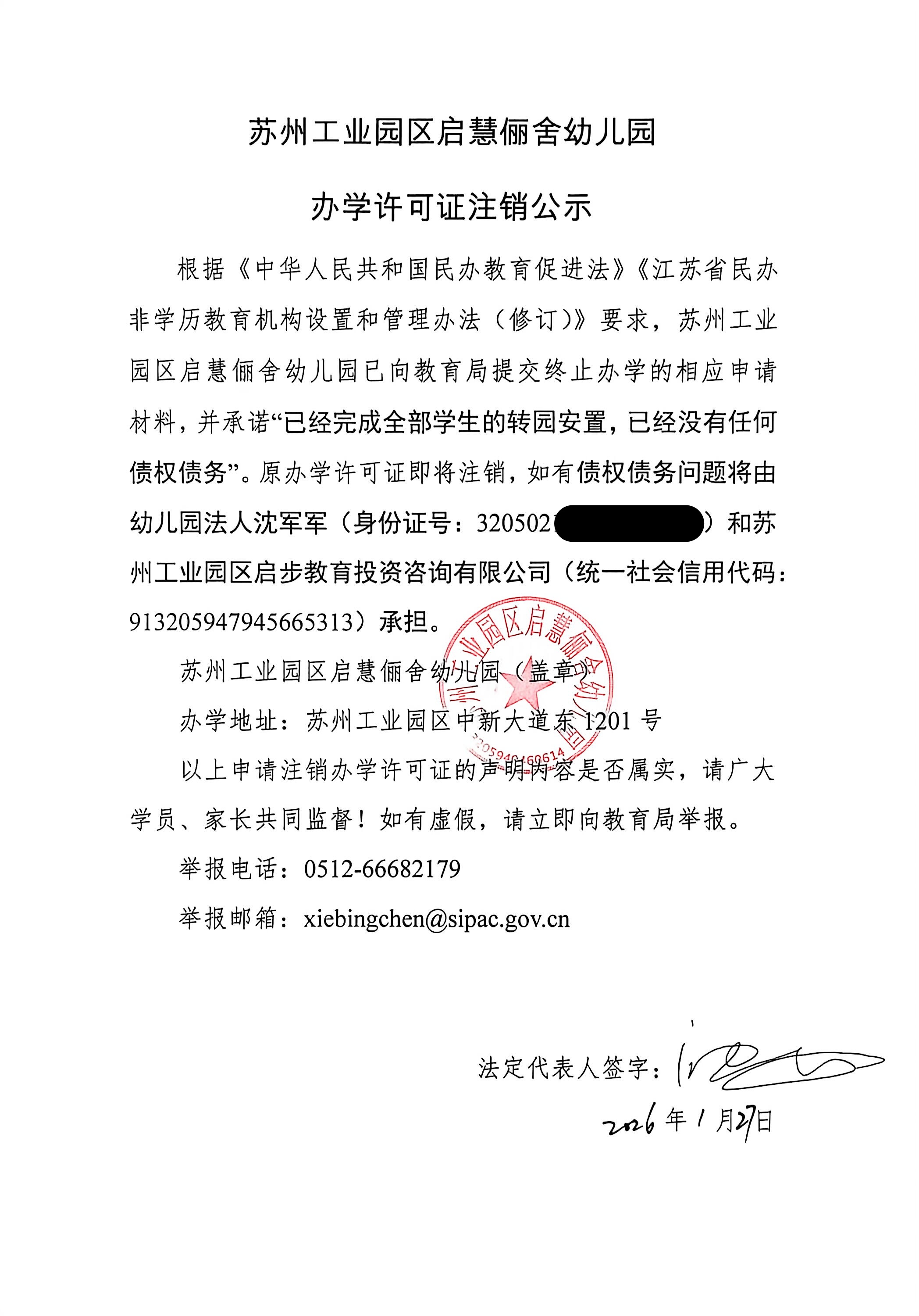 蘇州工業(yè)園區(qū)啟慧儷舍幼兒園辦學(xué)許可證注銷(xiāo)公示