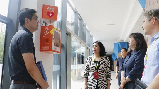 調研組一行首先前往玲瓏灣社區,實地考察社區內AED的安裝位置、設備維護及公眾可及性等情況。隨后,走進西安交通大學蘇州附屬初級中學,深入了解了校園內AED的配置數量、標識指引以及師生培訓情況。